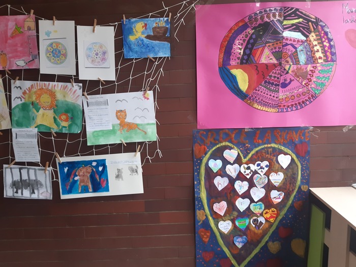 Obrázky naší laskavosti, obrázky našich zvířátek a různorodé výrobky zdobí chodbu školní družiny.